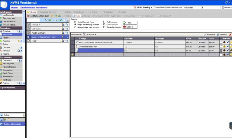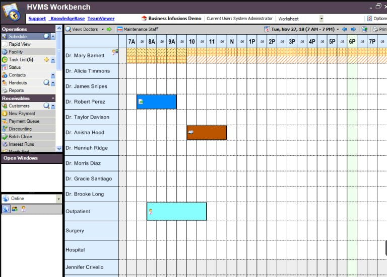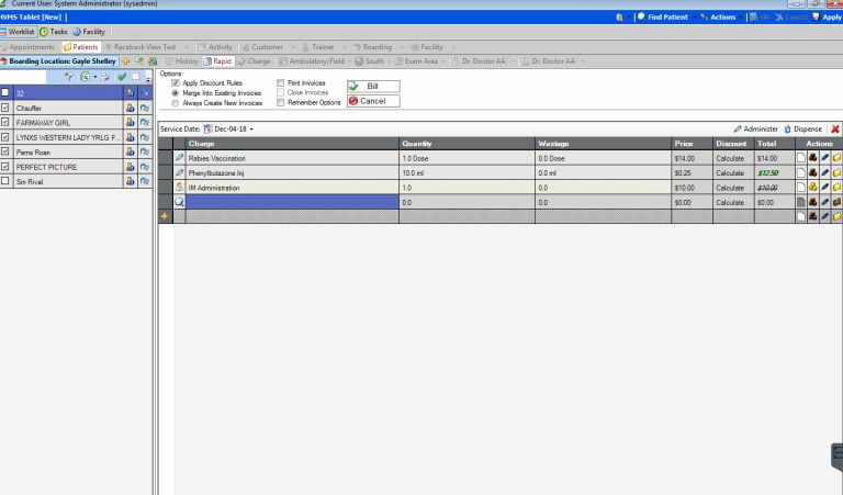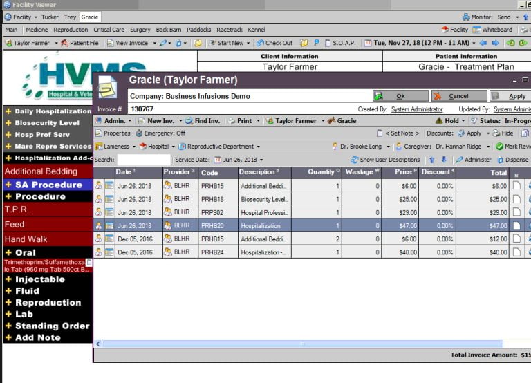 HVMS Facility Manager integrates patient medical records, invoicing and inventory control into a visual Whiteboard by allowing your team to electronically create treatment schedules and complete those treatments in real time providing a complete solution to your outpatient and hospitalized cases.
